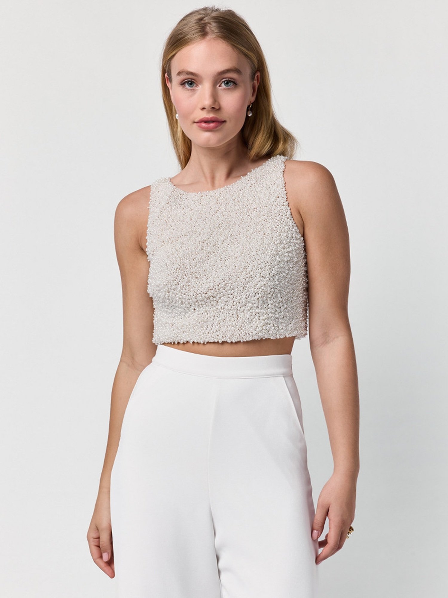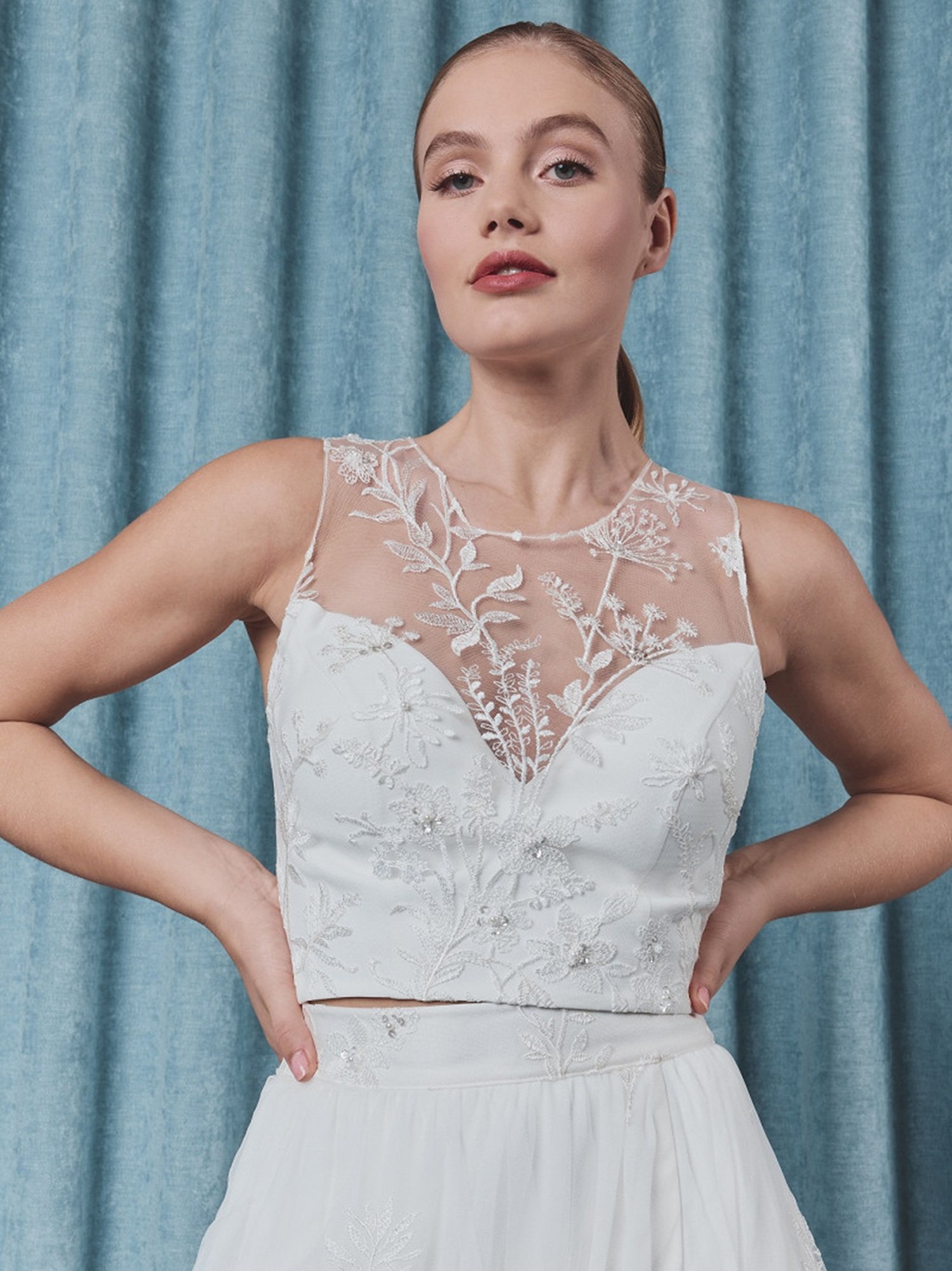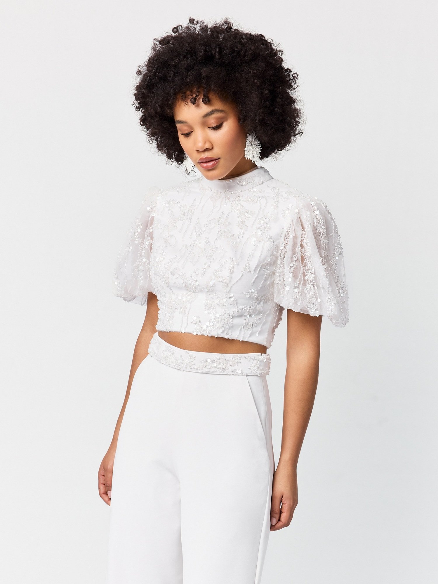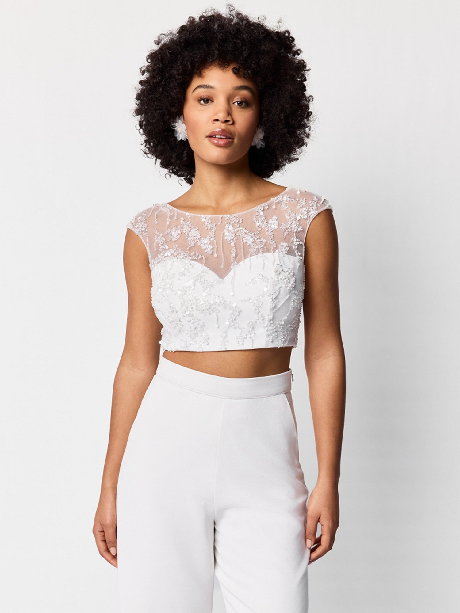Hier findest du eine Auswahl unserer wunderschönen Oberteile mit Spitze, Perlen, Federn, Pailetten.